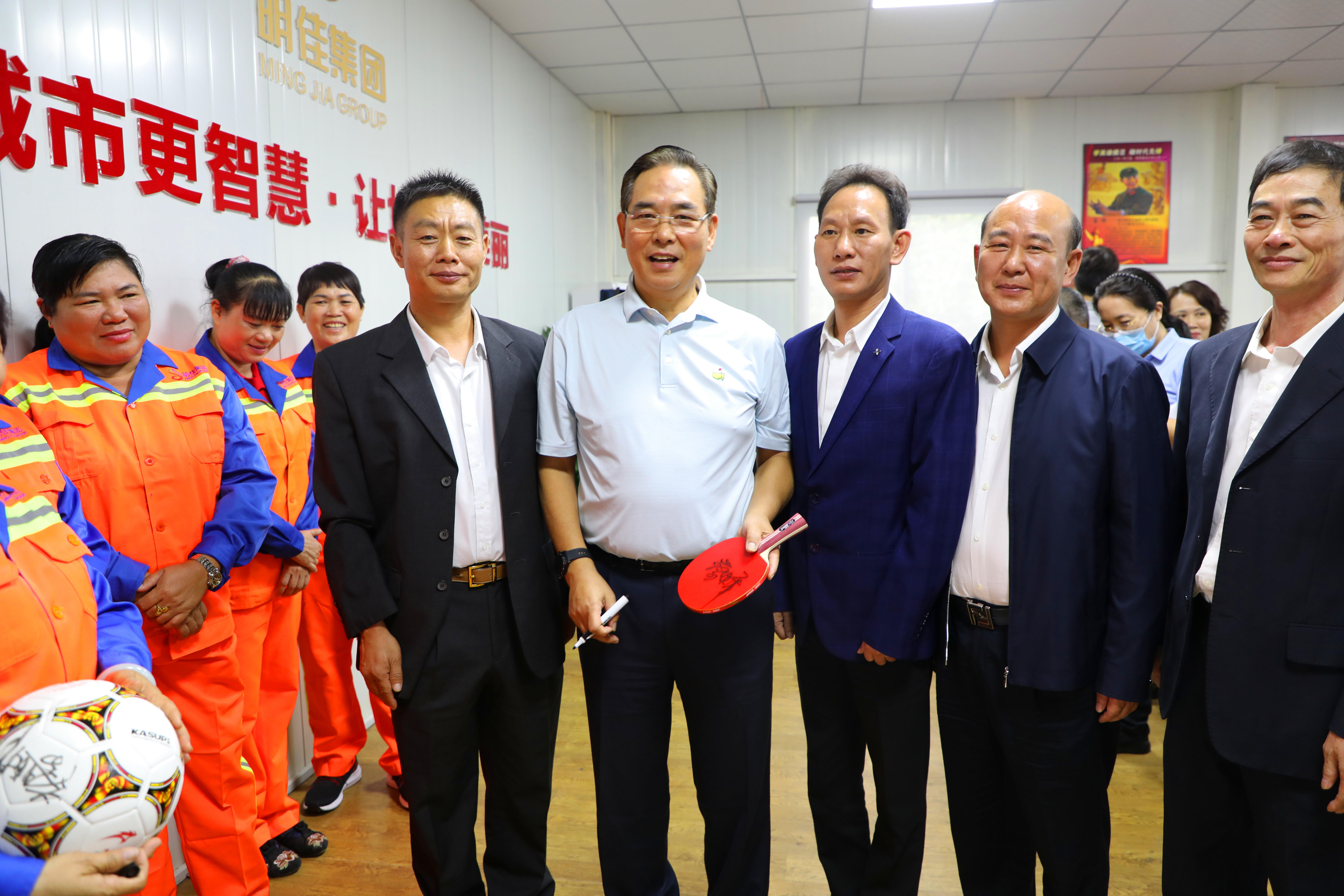 座談會結束后,明佳集團一些職工表示非常喜愛乒乓球及足球運動,一直都是蔡副主席的粉絲,希望獲得蔡振華副主席的親筆簽名。蔡副主席非常親切地為他們簽名,并與之合影留念。