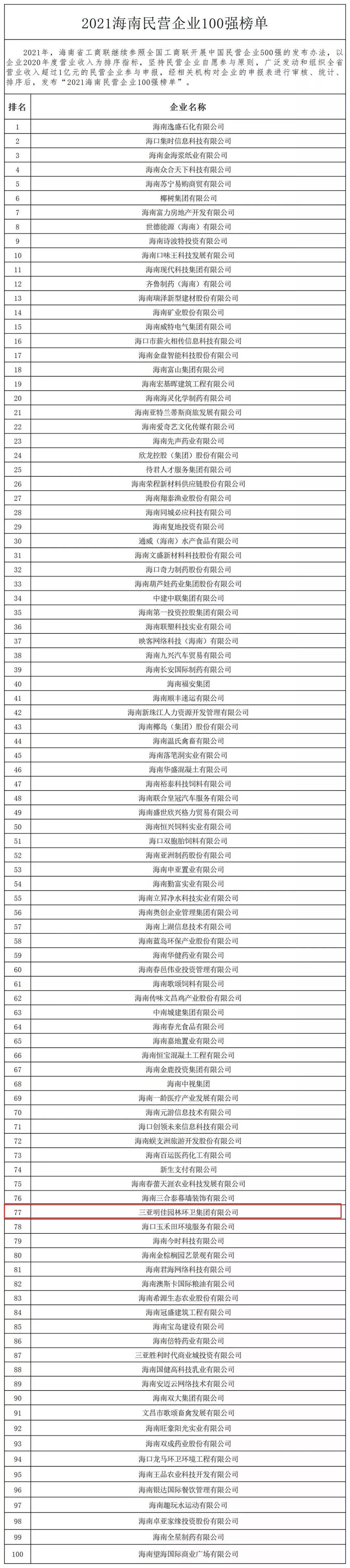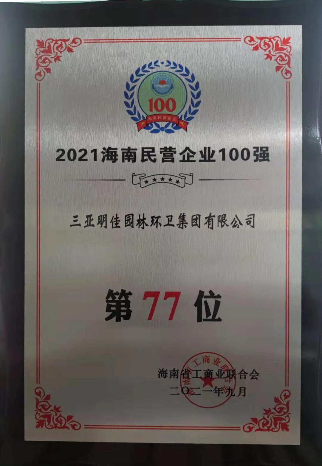 11月4日,海南省工商業(yè)聯(lián)合會(huì)在?诎l(fā)布“2021海南民營(yíng)企業(yè)100強(qiáng)”榜單。三亞明佳園林環(huán)衛(wèi)集團(tuán)有限公司2019至2021年連續(xù)三年入選海南民營(yíng)企業(yè)100強(qiáng)。