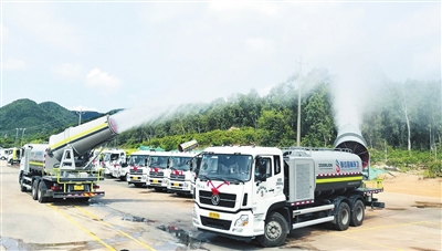5月9日,三亞新增的21輛新型環(huán)衛(wèi)車同時(shí)亮相,整裝待發(fā)。圖為兩輛多功能抑塵車現(xiàn)場(chǎng)展示噴霧抑塵功能。