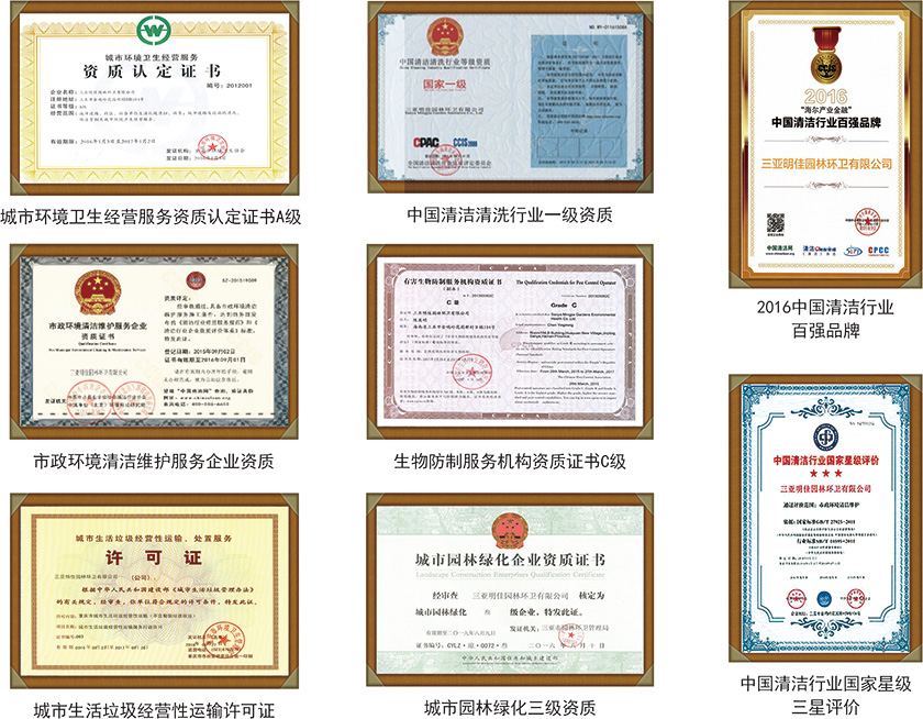 公司擁有建筑物外立面清潔養(yǎng)護施工甲級資質(zhì)、建筑物有害生物防治施工甲級資質(zhì)、建筑物日常清潔養(yǎng)護施工甲級資質(zhì)、中國清潔行業(yè)企業(yè)等級一級資質(zhì)證書、城市園林綠化企業(yè)資質(zhì)證書、有害生物防制服務(wù)機構(gòu)資質(zhì)證書C級、有害生物防制服務(wù)機構(gòu)C級資質(zhì)證書、中國清潔清洗行業(yè)國家一級等級資質(zhì)、城市生活垃圾經(jīng)營性清掃、收集、運營許可證;城市生活垃圾經(jīng)營性運輸、處置工作許可證、環(huán)境管理體系認(rèn)證證書、城市環(huán)境衛(wèi)生經(jīng)營服務(wù)資質(zhì)認(rèn)定證書(GB/T240012004/IOS14001:2004標(biāo)準(zhǔn))、職業(yè)健康安全管理體系認(rèn)證證書(GB/T28001—2011/OHSAS18001:2007標(biāo)準(zhǔn))、質(zhì)量管理體系認(rèn)證證書(GB/T19001—2008/iOS9001:2007標(biāo)準(zhǔn))、市政環(huán)境清潔維護服務(wù)企業(yè)資質(zhì)證書